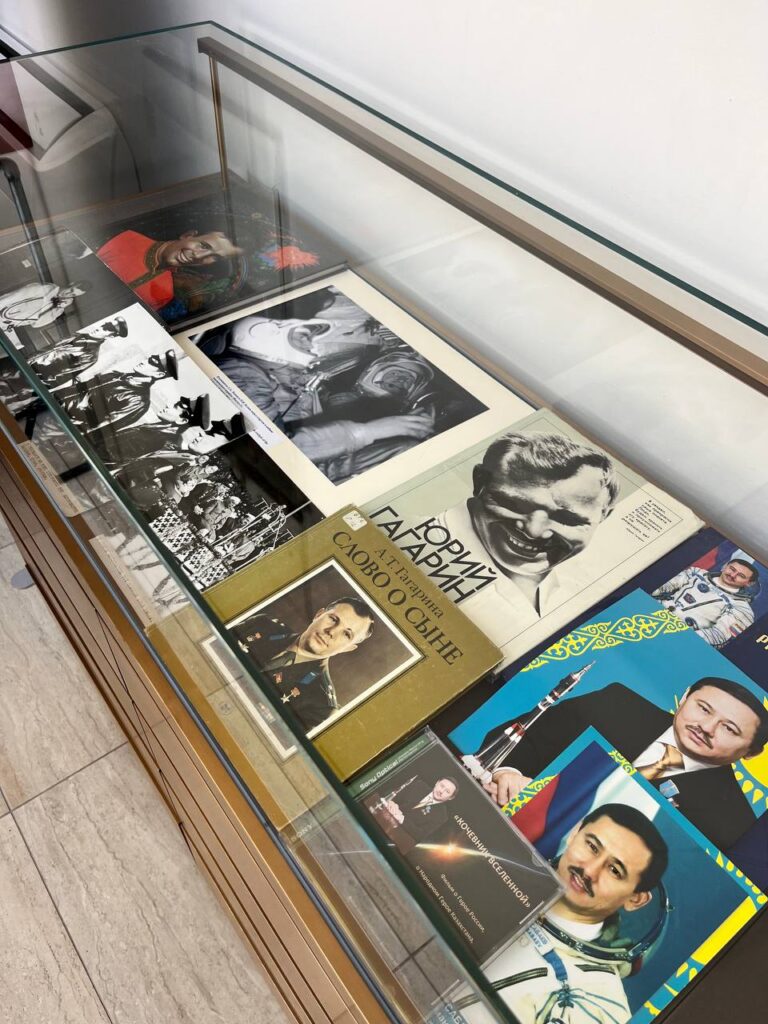 В экспозиции представлены фотографии космонавта, а также материалы о его жизненном пути, диск с фильмом «Кочевник Вселенной» и книга Сары Кабикызы «Знак равенства».
